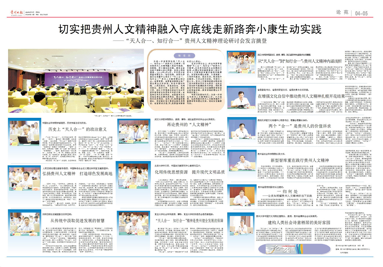 2016年8月17日,《贵州日报》04-05版《论苑》栏目刊载“切实把贵州人文精神融入守底线走新路奔小康生动实践——‘天人合一、知行合一’贵州人文精神理论研讨会发言摘登”,刊发贵州大学中国文化书院荣誉院长、贵州省儒学会会长张新民教授等12位专家在研讨会上的发言摘要。现原文照录“编者按”及张新民教授发言摘要——“建构人类社会诗意栖居的美好家园”。
