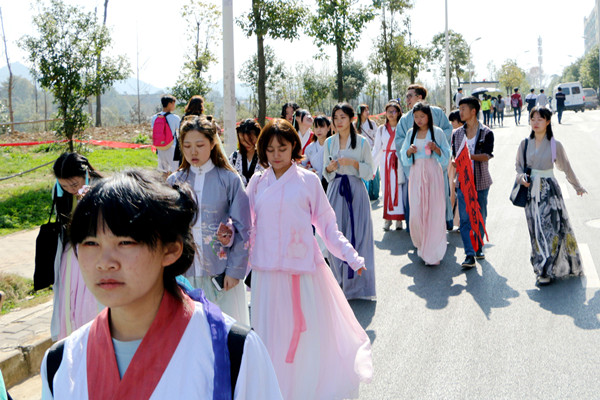 为让更多的同学了解中国传统服饰文化,推动汉服现代化变革,欣赏中国传统文化之美,2016年11月20日,贵州大学学生古风社团“汉风府”举行弘扬中华优秀传统文化、增强传统服饰文化自信的汉服校园行活动。
