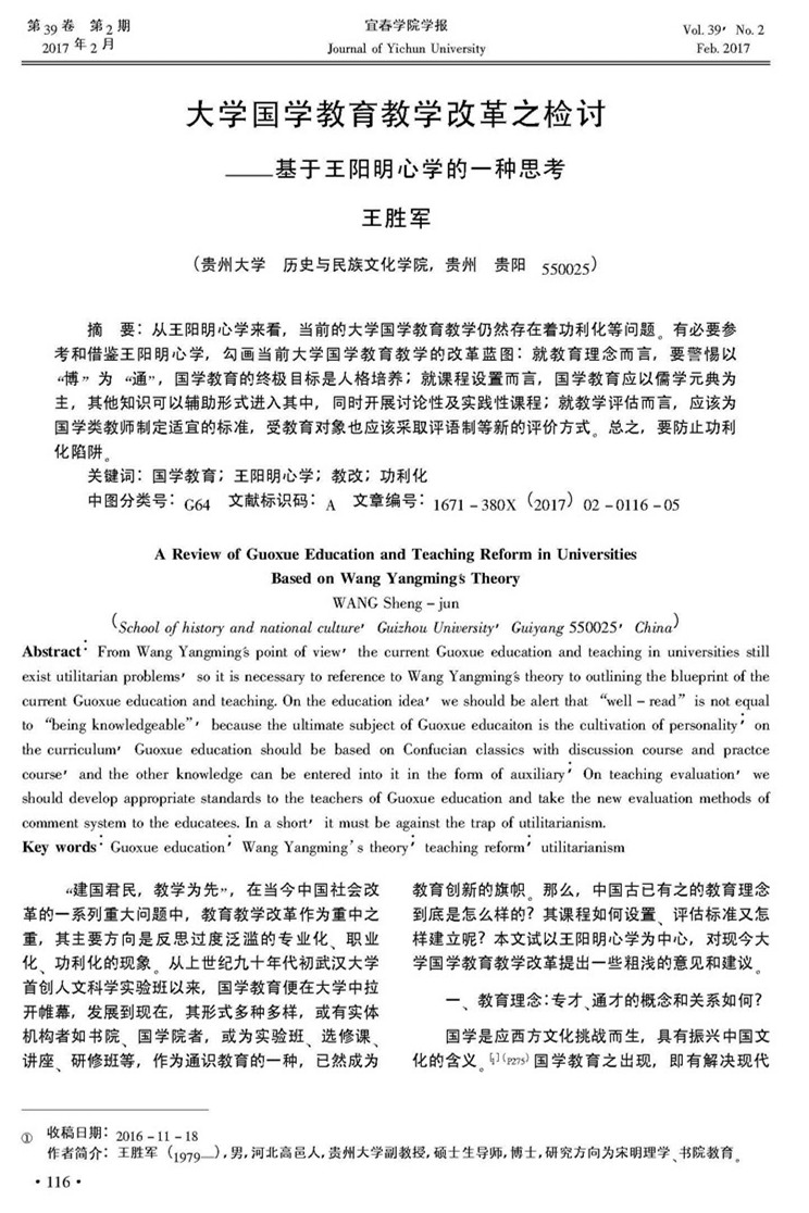 2017年第2期《宜春学院学报》刊载贵州大学历史与民族文化学院(中国文化书院)王胜军副教授论文,题:“大学国学教育教学改革之检讨——基于王阳明心学的一种思考”。全文如下: