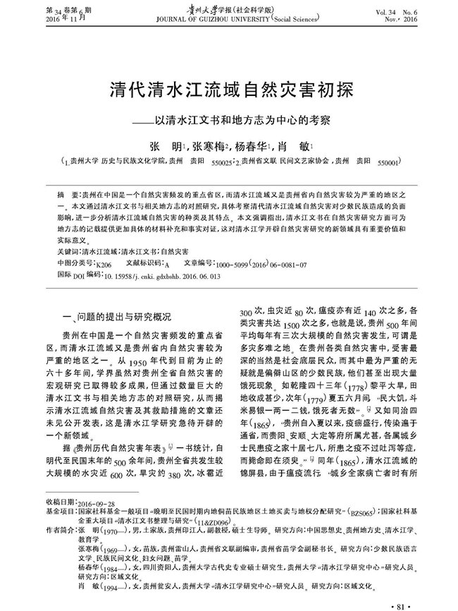 2016年11月第34卷第6期《贵州大学学报》(社会科学版)刊载贵州大学历史与民族文化学院(中国文化书院)张明副教授等“清水江学”研究论文。全文如下: