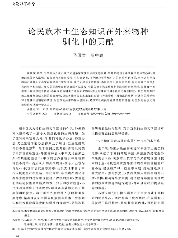 2017年第1期《云南社会科学》刊载贵州大学历史与民族文化学院(中国文化书院)马国君教授等论文“论民族本土生态知识在外来物种驯化中的贡献”。全文如下: