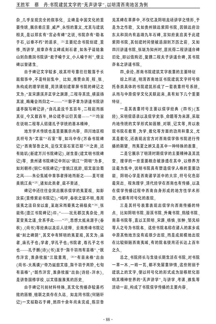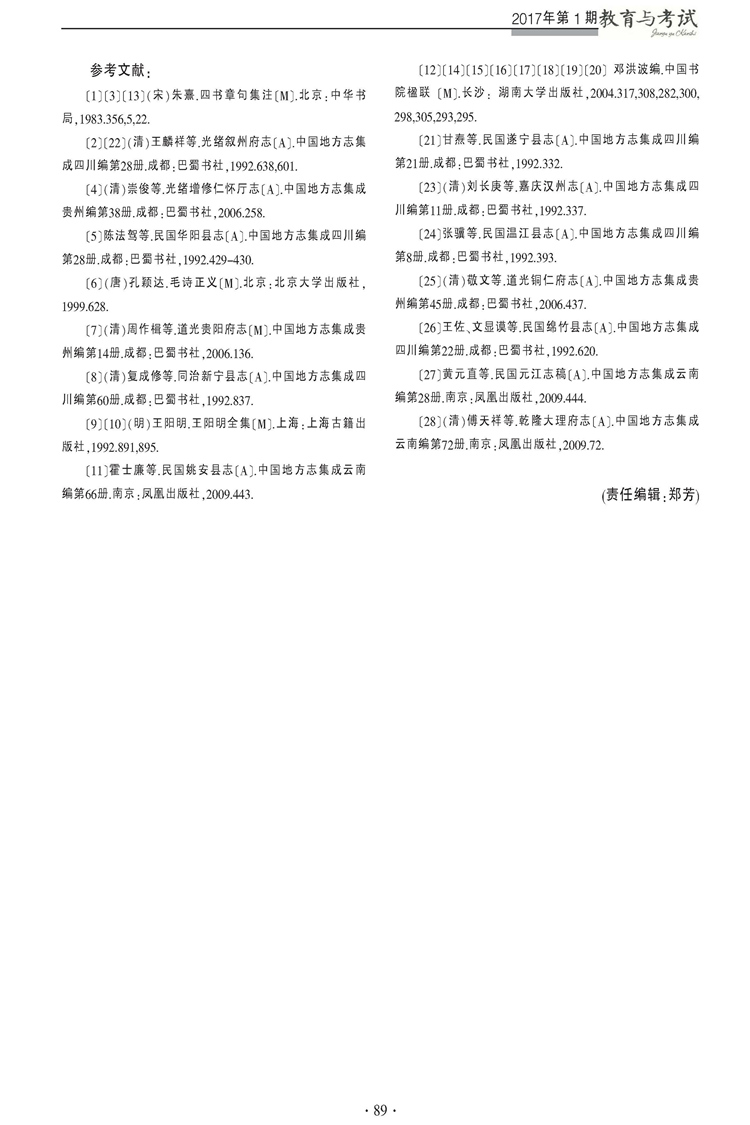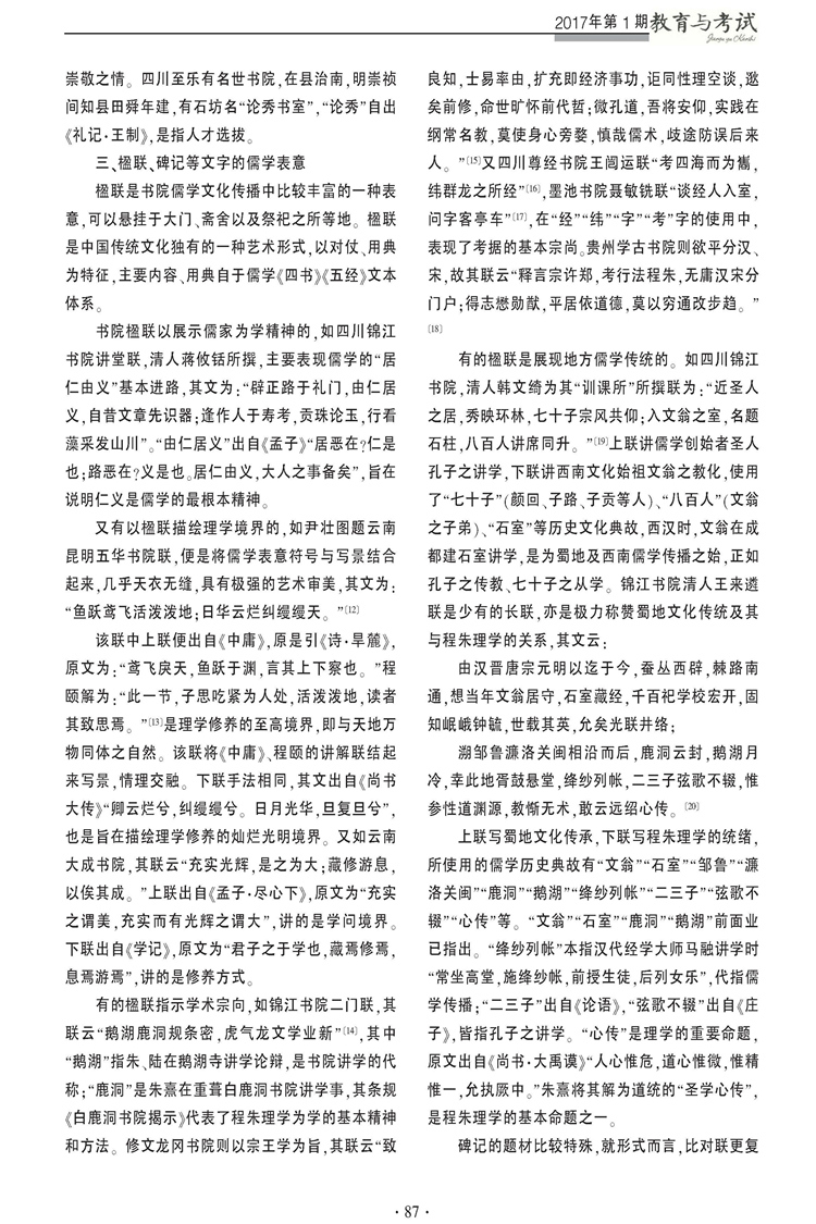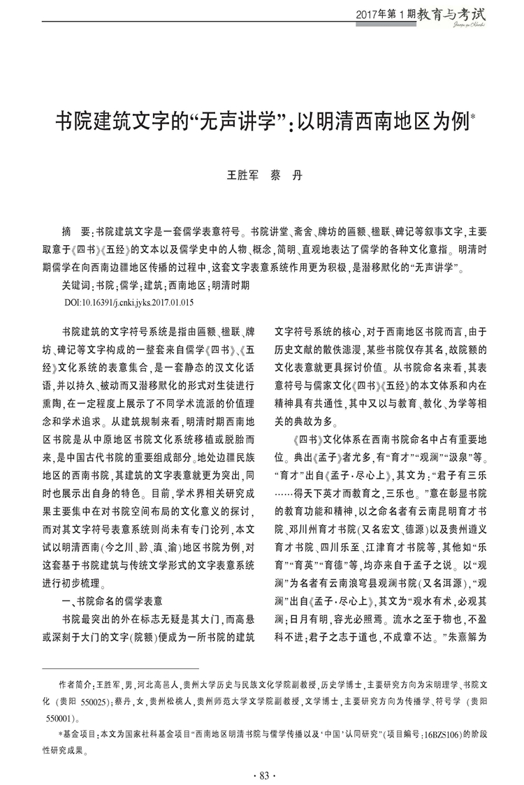 2017年第1期《教育与考试》刊载贵州大学历史与民族文化学院(中国文化书院)王胜军副教授等论文“书院建筑文字的‘无声讲学’:以明清西南地区为例”。全文如下: