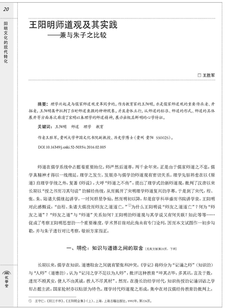 2016年第二期《孔学堂》杂志刊载贵州大学中国文化书院副教授王胜军博士“阳明学”研究中英文论文,题:王阳明师道观及其实践——兼与朱子之比较。中文全文如下: