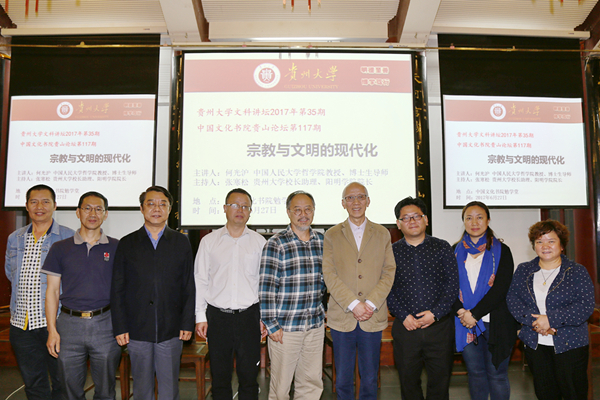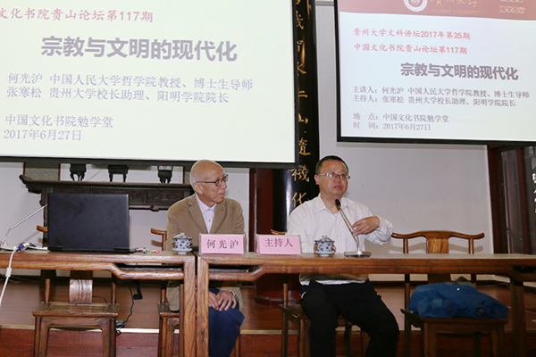2017年6月27日晚间,贵州大学“文科讲坛”2017年第35期、贵州大学历史与民族文化学院(中国文化书院)“贵山论坛”第117期在贵州大学中国文化书院勉学堂举行。国内知名学者、中国人民大学哲学院博士生导师何光沪教授主讲“宗教与文明现代化”。讲座由贵州大学哲学社会科学研究院主办,贵州大学哲学与社会发展学院、贵州大学历史与民族文化学院(中国文化书院)、贵州大学阳明学院联合承办。