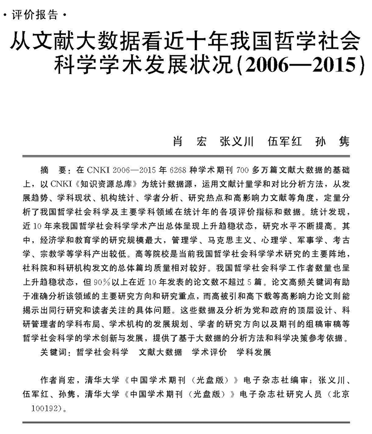 2017年第1期《中国社会科学评价》杂志刊载肖宏等研究评价报告,题:“从文献大数据看我国哲学社会科学学术发展状况(2006-2015)”。