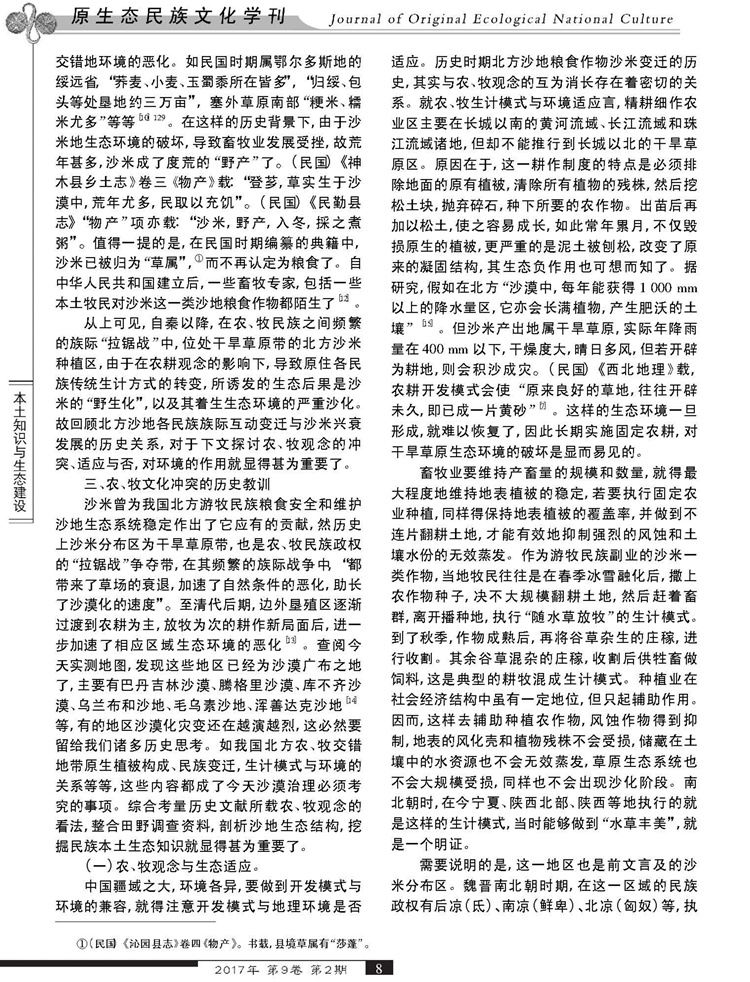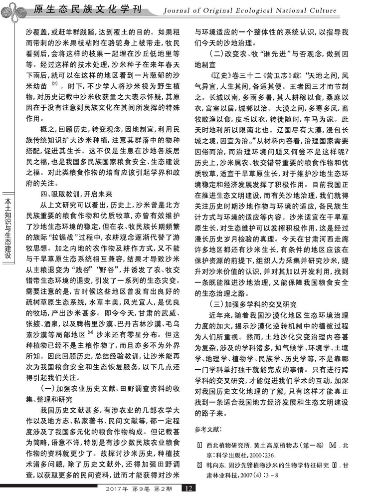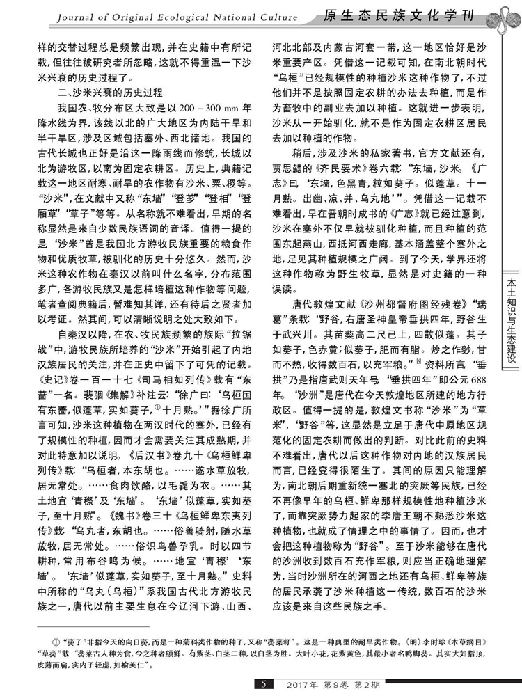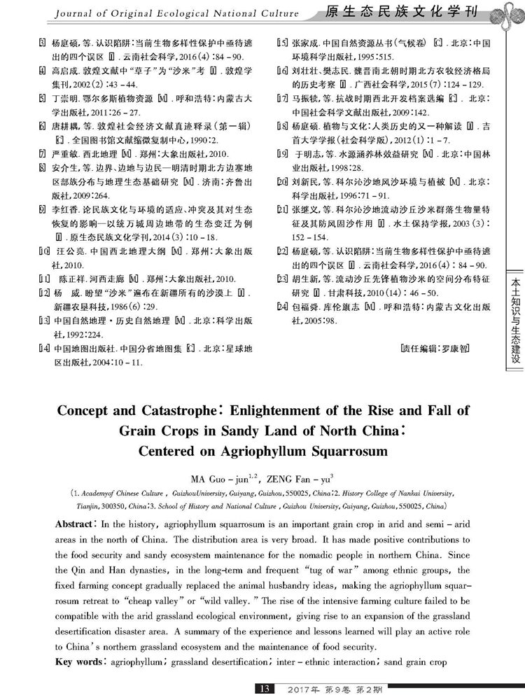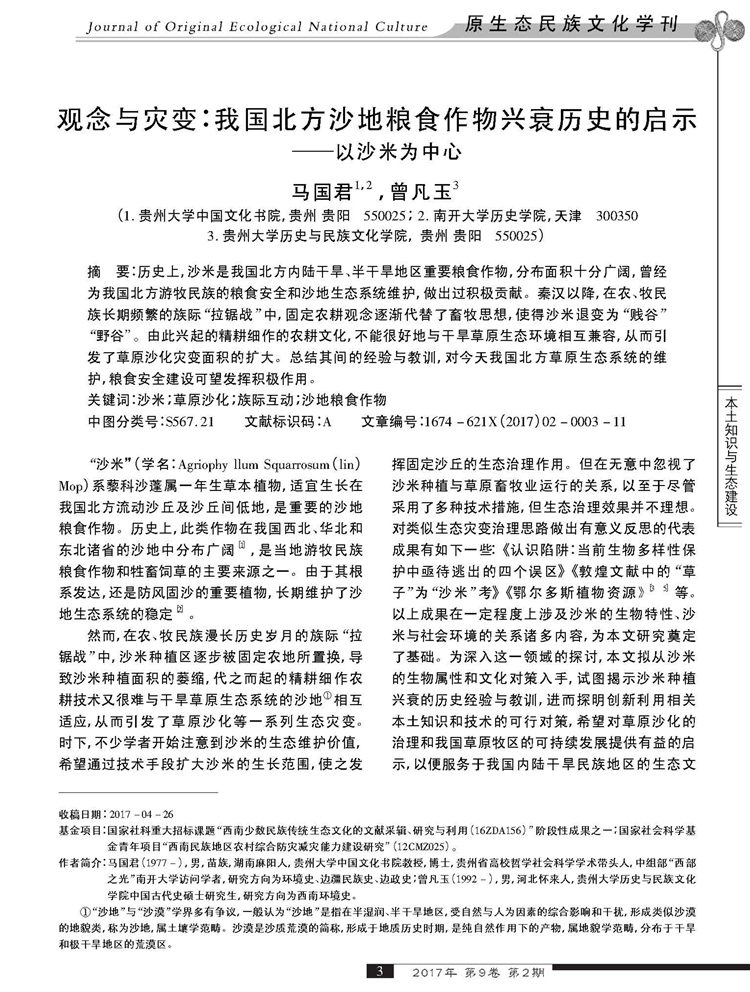 2017年第2期《原生态民族文化学刊》刊载贵州省高校哲学社会科学学术带头人、中组部“西部之光”南开大学访问学者、贵州大学历史与民族文化学院(中国文化书院)马国君教授,以及贵州大学历史与民族文化学院中国古代史硕士研究生曾凡玉,国家社科重大招标课题“西南少数民族传统生态文化的文献采辑、研究与利用(16ZDA156)、国家社会科学基金青年项目“西南民族地区农村综合防灾减灾能力建设研究”(12CMZ025)阶段性成果之一,题:观念与灾变:我国北方沙地粮食作物兴衰历史的启示——以沙米为中心。全文如下: