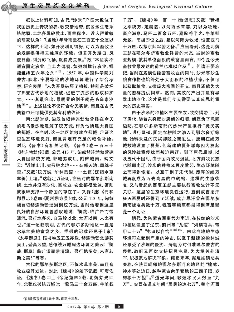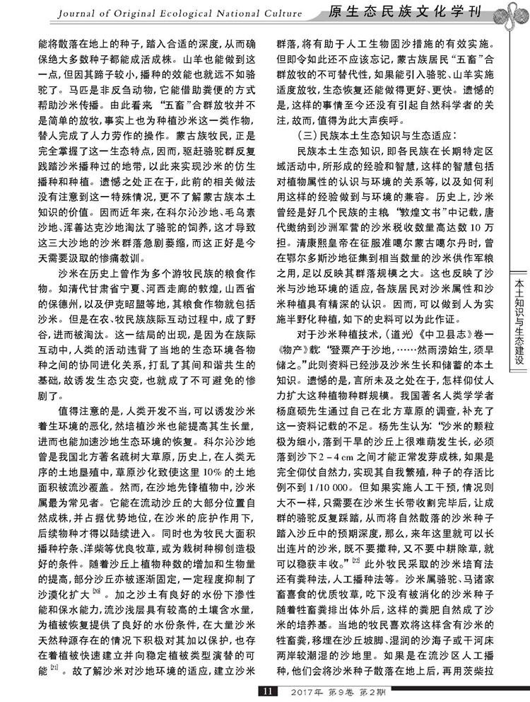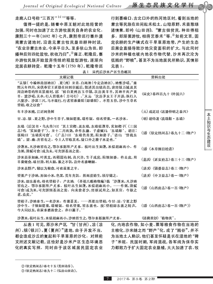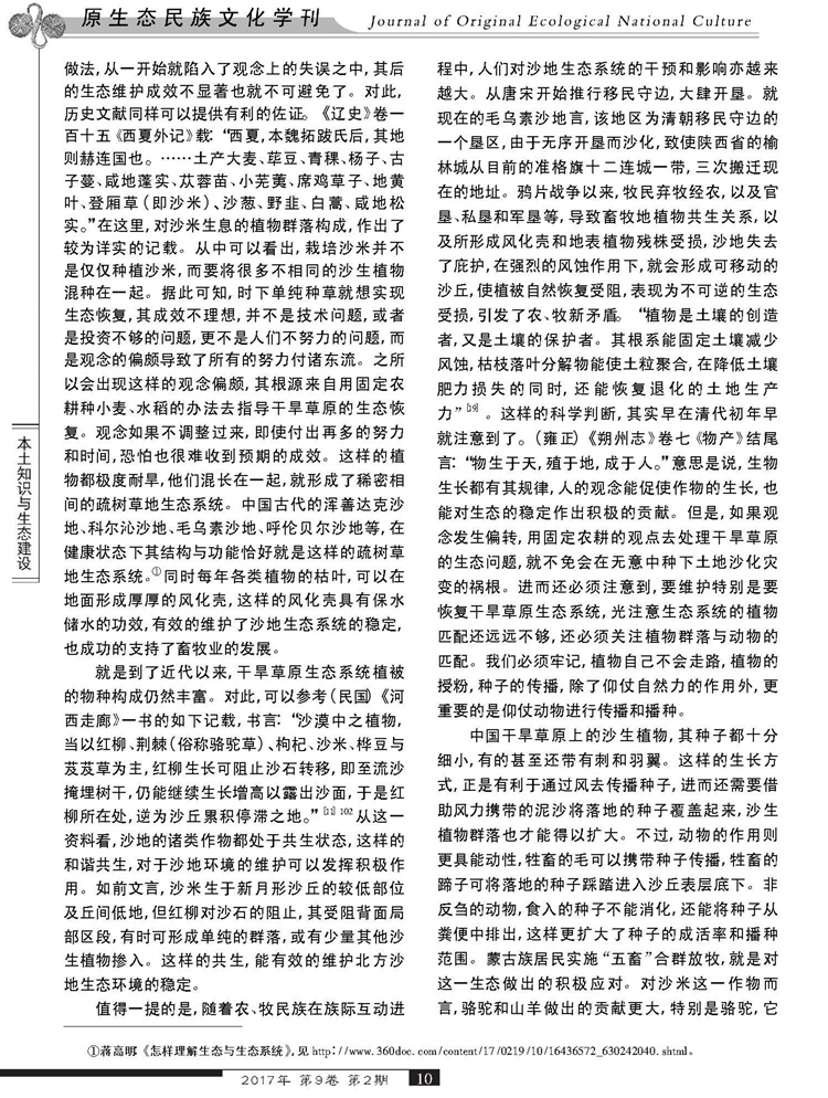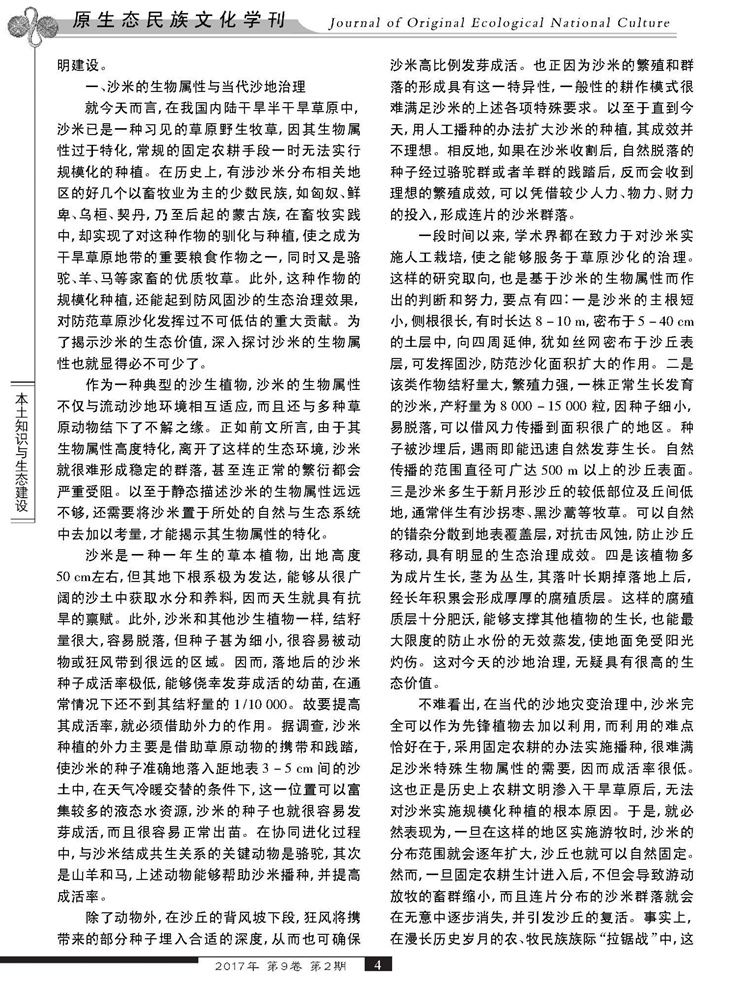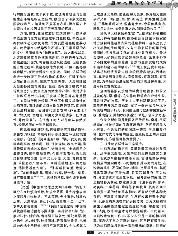 2017年第2期《原生态民族文化学刊》刊载贵州省高校哲学社会科学学术带头人、中组部“西部之光”南开大学访问学者、贵州大学历史与民族文化学院(中国文化书院)马国君教授,以及贵州大学历史与民族文化学院中国古代史硕士研究生曾凡玉,国家社科重大招标课题“西南少数民族传统生态文化的文献采辑、研究与利用(16ZDA156)、国家社会科学基金青年项目“西南民族地区农村综合防灾减灾能力建设研究”(12CMZ025)阶段性成果之一,题:观念与灾变:我国北方沙地粮食作物兴衰历史的启示——以沙米为中心。全文如下: