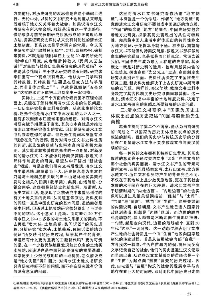 2017年8月第12卷第4期《贵阳学院学报》(社会科学版)刊载贵州大学历史与民族文化学院(中国文化书院)历史系、贵州大学“清水江研究中心”研究人员林芊教授国家社科基金一般项目“晚明至民国时期内地侗、苗民族地区土地买卖与地权分配研究”(项目编号:14BZS069)、国家社科基金重大项目“清水江文书整理与研究”(项目编号:11&ZD096)阶段性成果,题:清水江文书研究兼与赵世瑜先生商榷。全文如下: