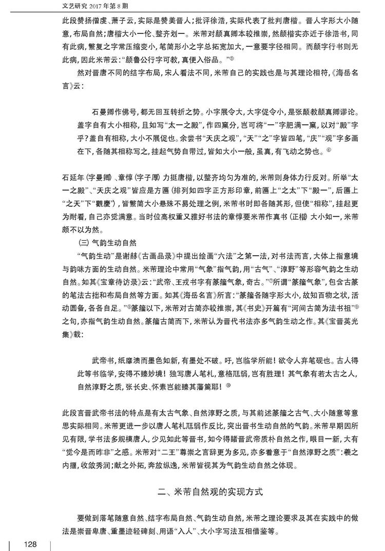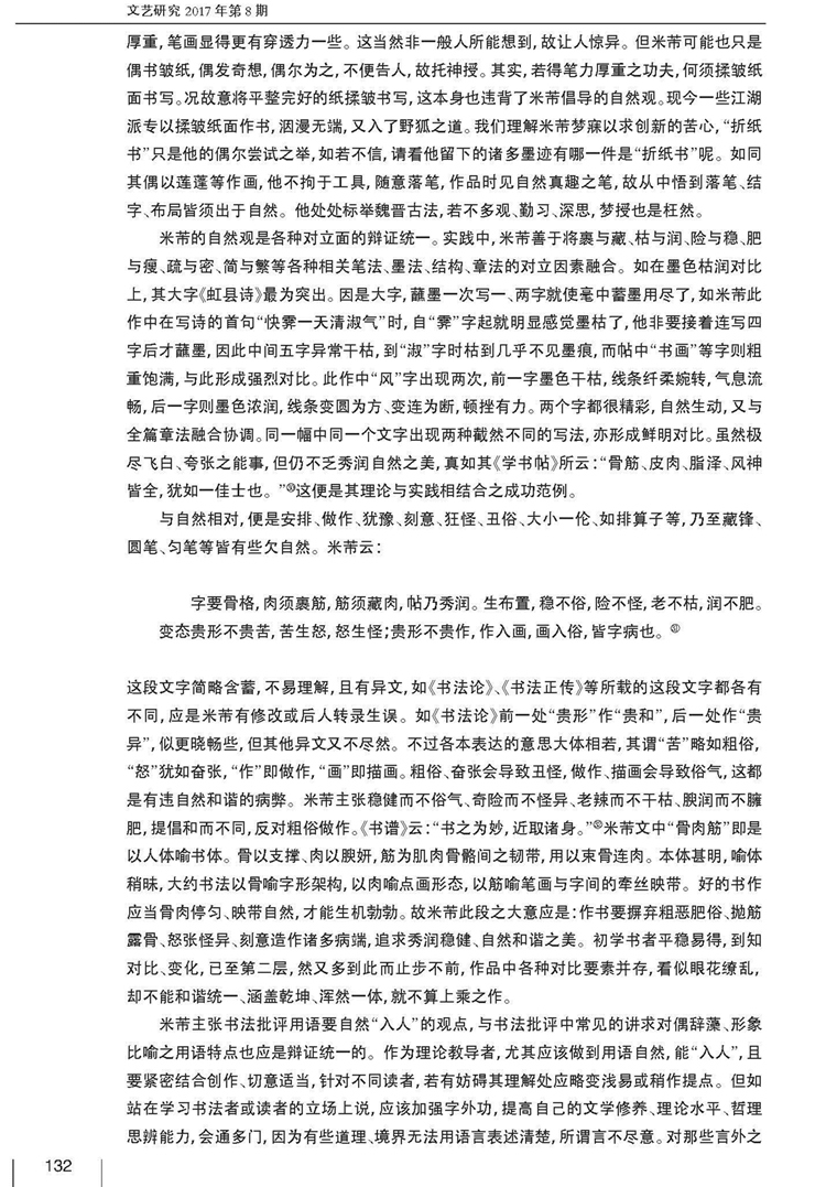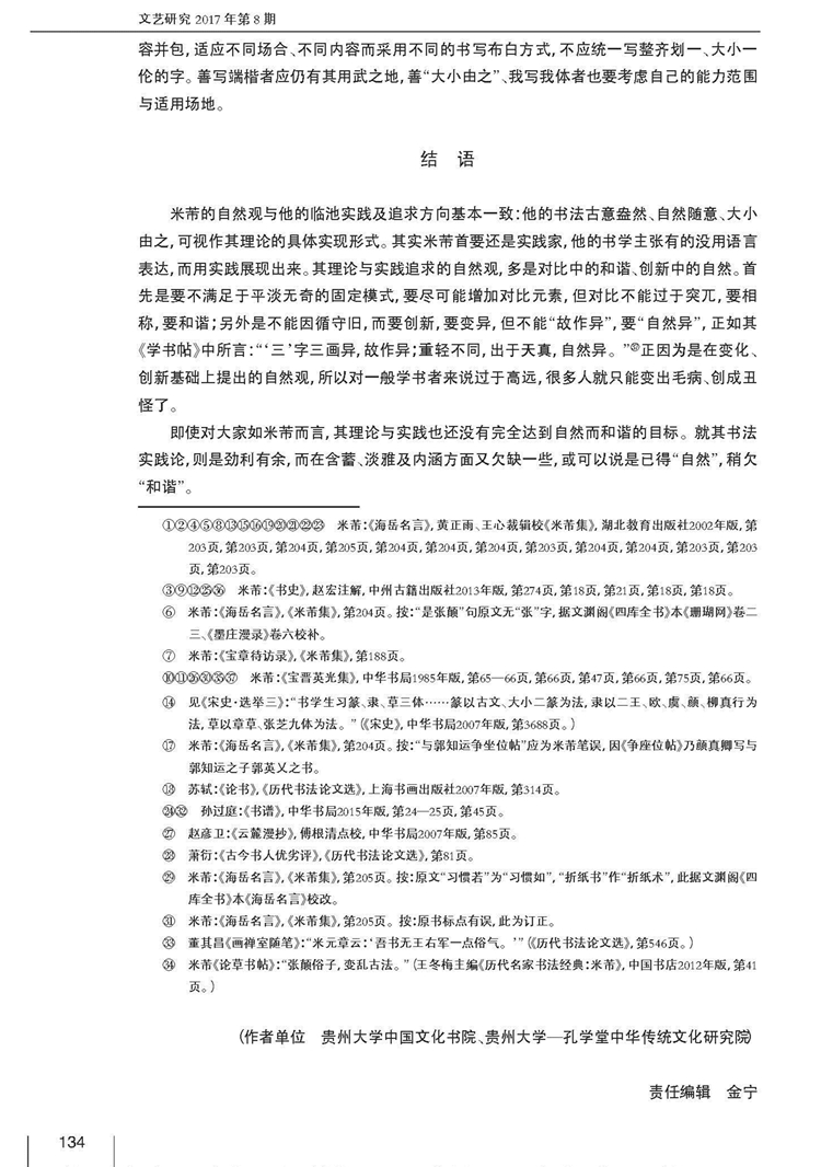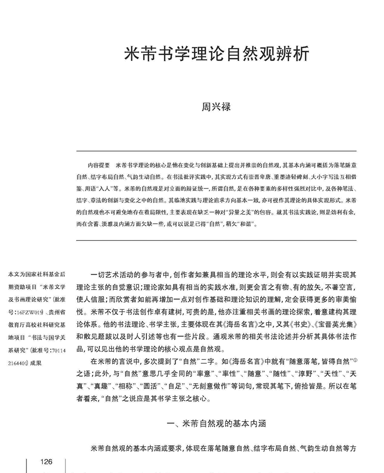 2017年第8期《文艺研究》刊载贵州大学历史与民族文化学院(中国文化书院)、贵州大学-孔学堂中华传统文化研究院周兴禄副教授国家社科基金后期资助项目“米芾文学及书画理论研究”(批准号:16FZW019)、贵州省教育厅高校社科研究基地项目“书法与国学关系研究”(批准号:701142164401)成果,题:米芾书学理论自然观辨析。全文如下: