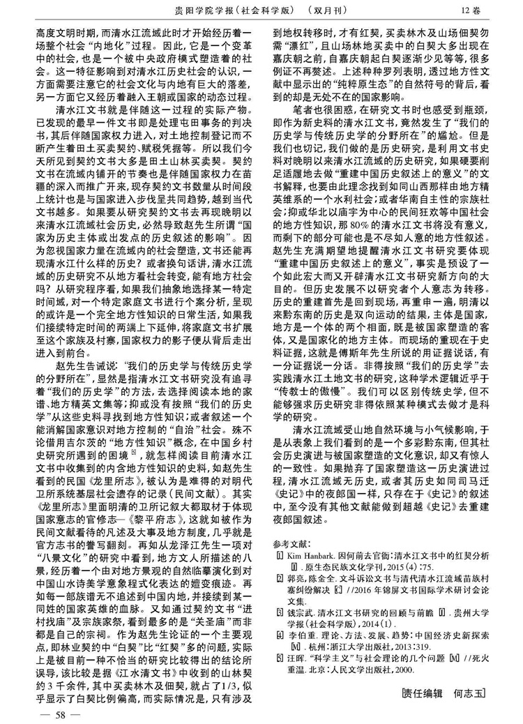 2017年8月第12卷第4期《贵阳学院学报》(社会科学版)刊载贵州大学历史与民族文化学院(中国文化书院)历史系、贵州大学“清水江研究中心”研究人员林芊教授国家社科基金一般项目“晚明至民国时期内地侗、苗民族地区土地买卖与地权分配研究”(项目编号:14BZS069)、国家社科基金重大项目“清水江文书整理与研究”(项目编号:11&ZD096)阶段性成果,题:清水江文书研究兼与赵世瑜先生商榷。全文如下: