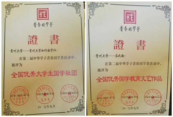 贵州大学知行国学社荣获“全国优秀大学生国学社团”