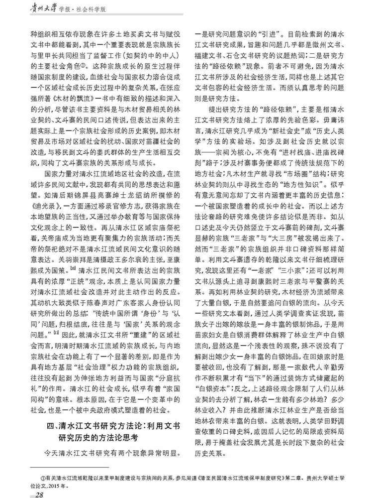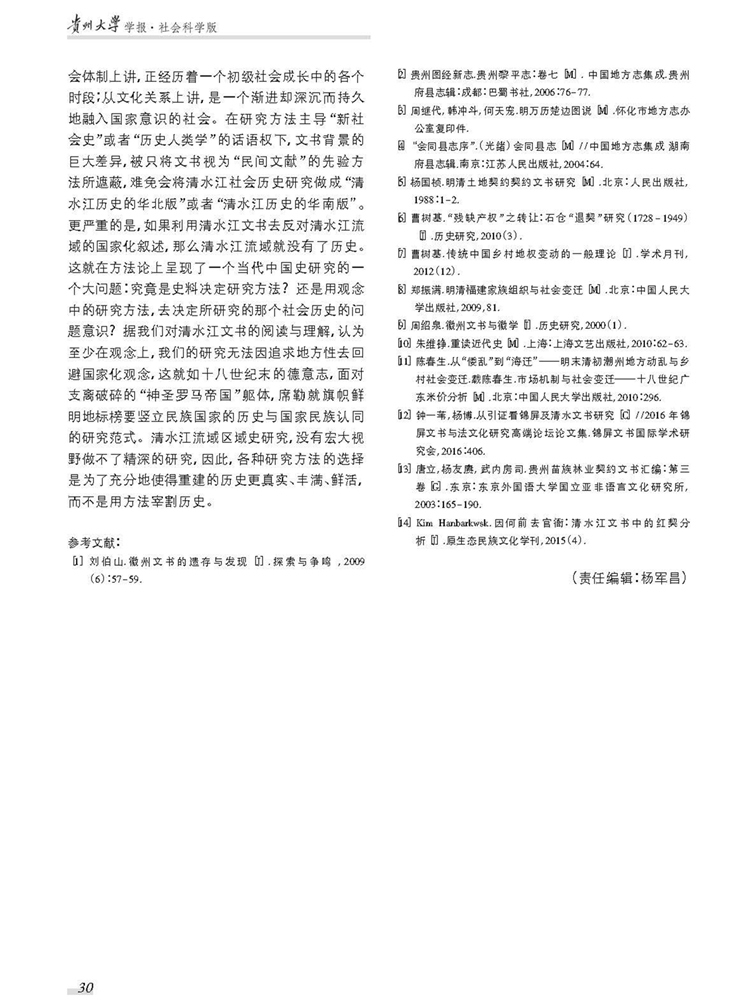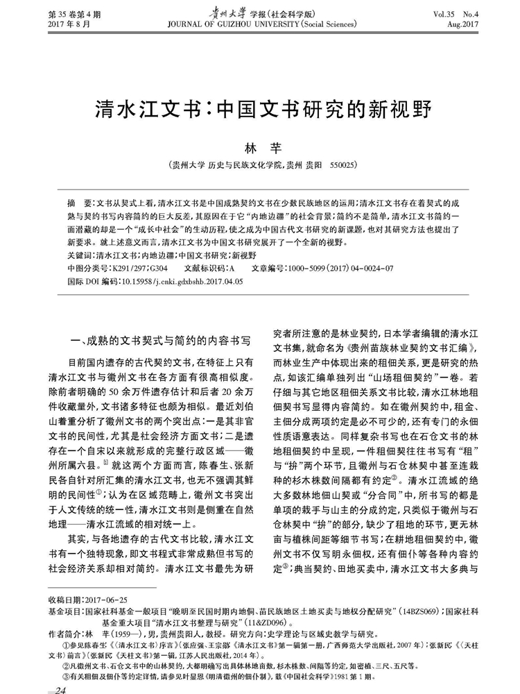 2017年8月第35卷第4期《贵州大学学报》(社会科学版)刊载贵州大学历史与民族文化学院(中国文化书院)历史系林芊教授国家社科基金一般项目“晚明至民国时期内地侗、苗民族地区土地买卖与地权分配研究”(14BZS069)、国家社科基金重大项目“清水江文书整理与研究”(11&ZD096)研究成果,题:清水江文书:中国文书研究的新视野。全文如下: