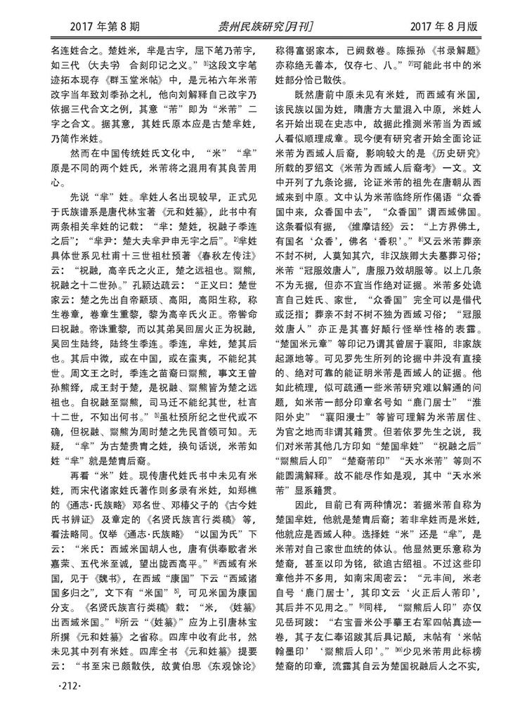 2017年第8期《贵州民族研究》刊载贵州大学历史与民族文化学院(中国文化书院)副教授、贵州大学—孔学堂中华传统文化研究院研究员周兴禄博士国家社会科学基金后期资助项目“米芾文学及书画理论研究”(编号:16FZW019)研究成果,题:米芾姓氏及民族考辨。全文如下:
