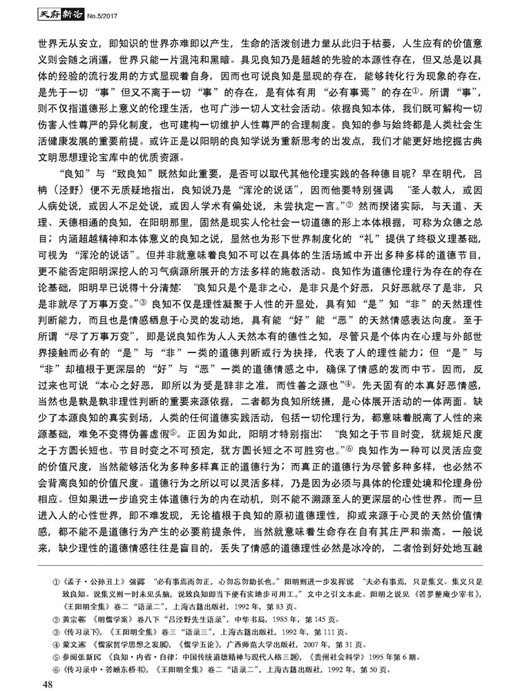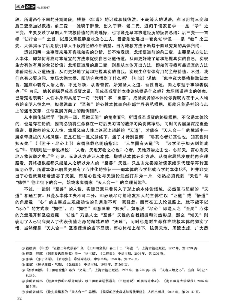 2017年第5期《天府新论》刊载贵州大学中国文化书院二级教授、荣誉院长张新民先生国家社科重大委托项目“阳明文化与现代国家治理研究”(编号:14@ZH054)、国家社科基金重点项目“阳明学诠释史研究”(编号:17AZX006)阶段性成果,题:德性生命的实践与价值世界的建构———论王阳明良知思想的四重结构。全文如下: