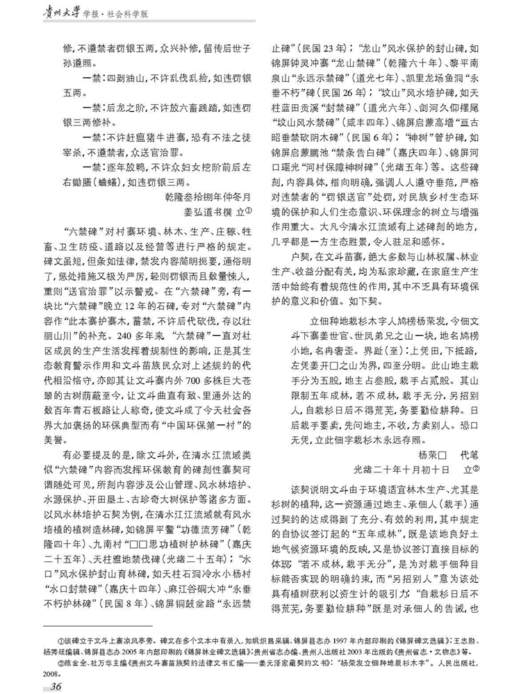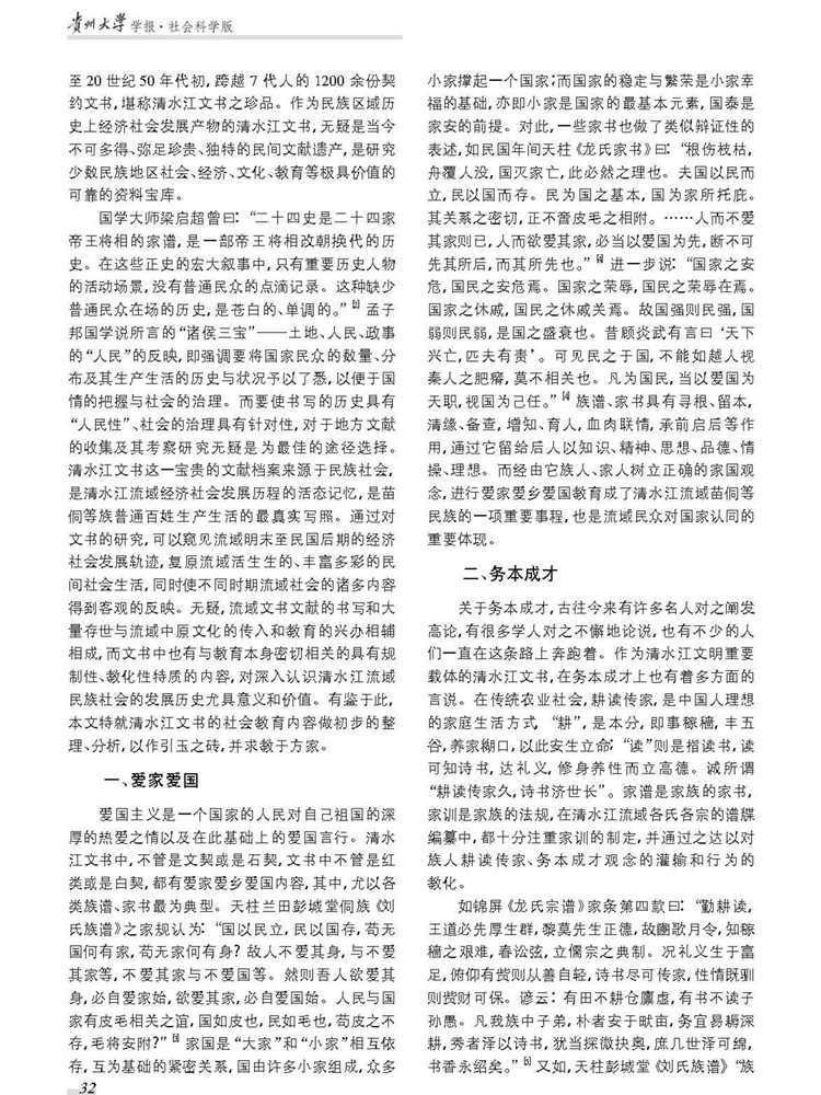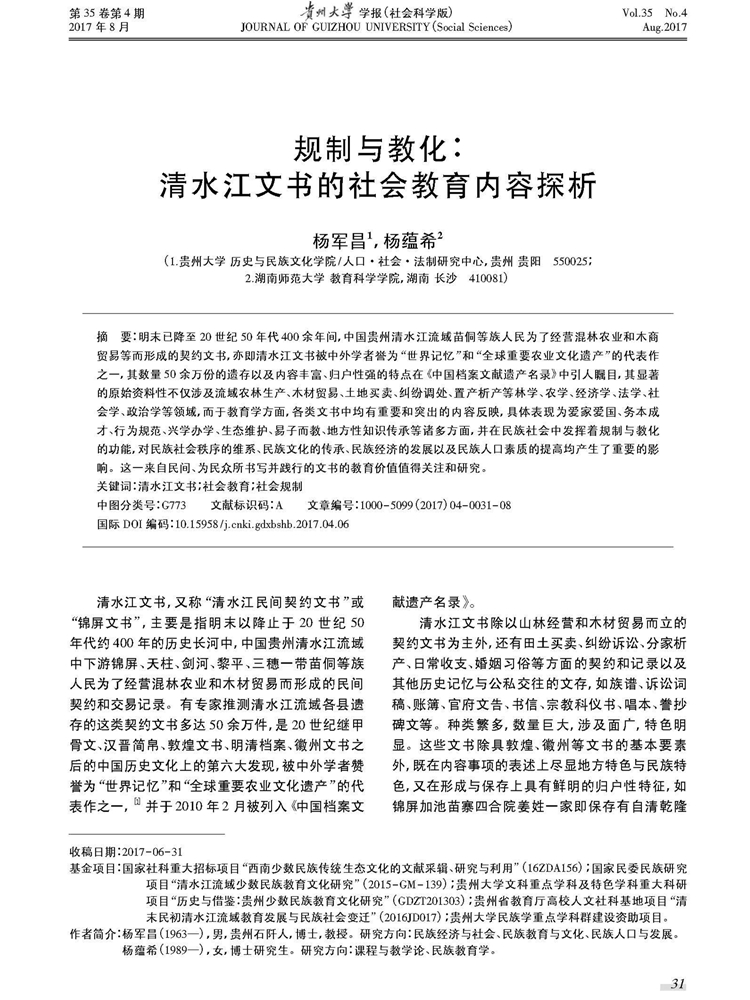 2017年8月第35卷第4期《贵州大学学报》(社会科学版)刊载贵州大学历史与民族文化学院(中国文化书院)及贵州大学人口·社会·法制研究中心杨军昌教授、湖南师范大学教育科学学院博士研究生杨蕴希研究论文。题:规制与教化:清水江文书的社会教育内容探析。
