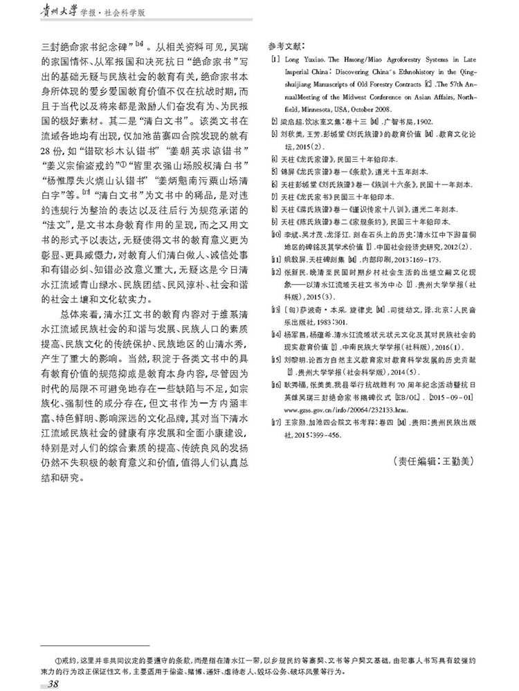 该研究为国家社科重大招标项目“西南少数民族传统生态文化的文献采辑、研究与利用”(16ZDA156)、国家民委民族研究项目“清水江流域少数民族教育文化研究”(2015-GM-139)、贵州大学文科重点学科及特色学科重大科研项目“历史与借鉴:贵州少数民族教育文化研究”( GDZT201303)、贵州省教育厅高校人文社科基地项目“清末民初清水江流域教育发展与民族社会变迁”(2016JD017)、贵州大学民族学重点学科群建设资助项目成果。全文如下:
