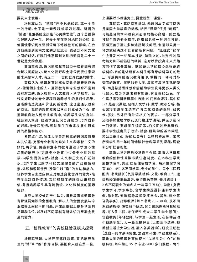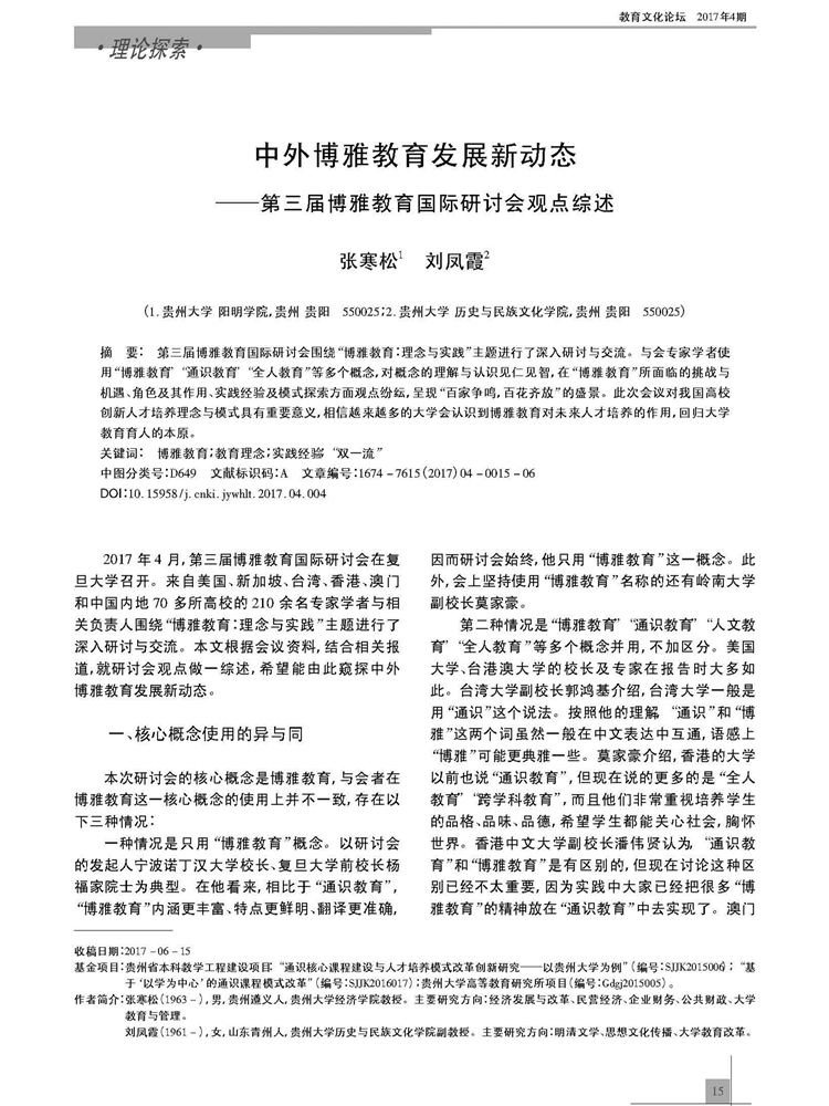 2017年4期《教育文化论坛》刊载贵州大学阳明学院、经济学院张寒松教授及原贵州大学历史与民族文化学院(中国文化书院)、现阳明学院刘凤霞副教授论文,题:中外博雅教育发展新动态——第三届博雅教育国际研讨会观点综述。