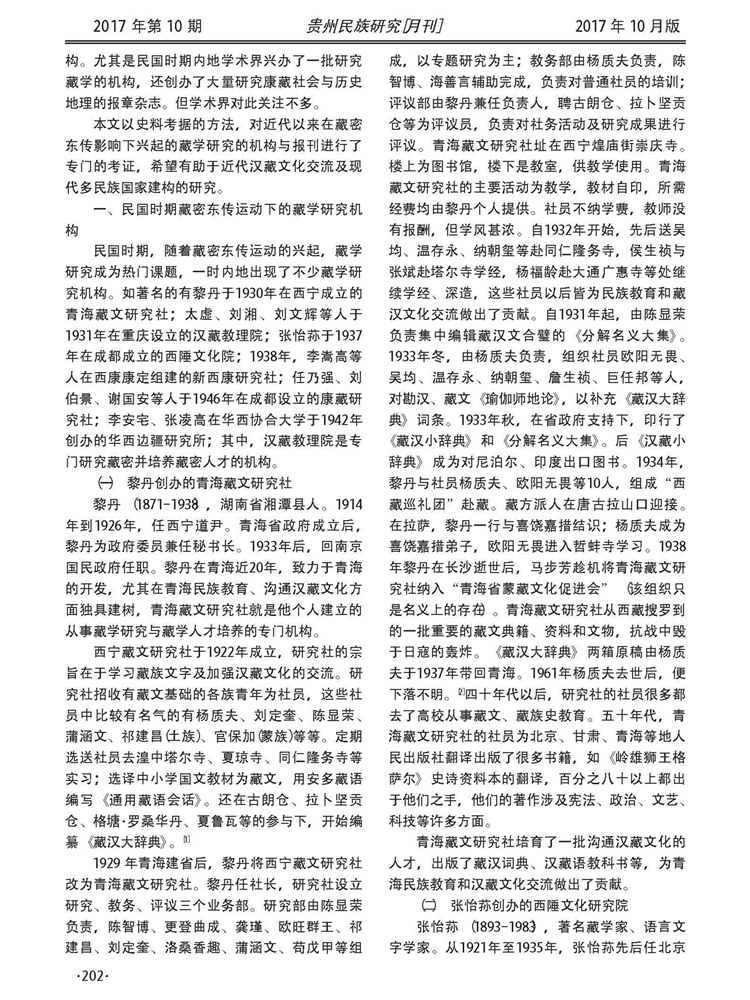 2017年第10期《贵州民族研究》刊载西北大学中国思想文化研究所博士后、贵州大学历史与民族文化学院(中国文化书院)讲师刘莹博士以及贵州大学马克思主义学院文厚泓副教授2015年国家社会科学基金西部项目“近代藏密东传与现代多民族国家建构研究”(批准号:15XMZ014)的阶段性成果,题:近代藏学研究机构与报刊考。全文如下: