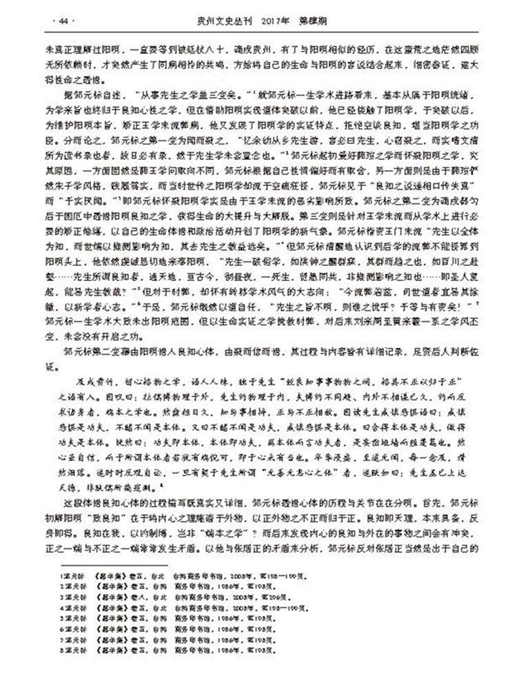 2017年第4期《贵州文史丛刊》刊载贵州大学历史与民族文化学院(中国文化书院)中国史专业毕业研究生、贵州大学清水江学研究中心研究兼职人员刘青衢关于“阳明后学”的国家社科重大委托项目“阳明文化与现代国家治理研究”(14@ZH054)、国家社科基金课题贵州大学校内培育项目“教化与融合:王阳明与明代南方民族治理问题研究”成果。全文如下: