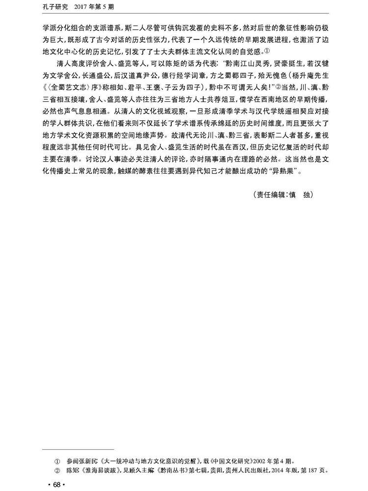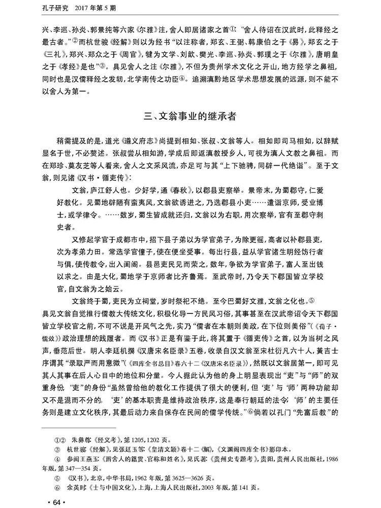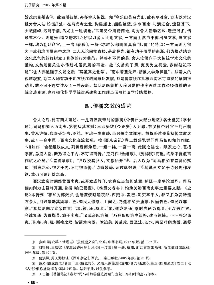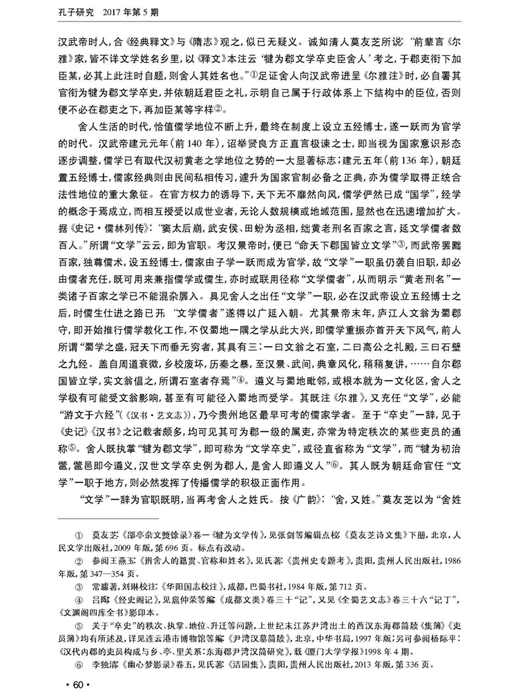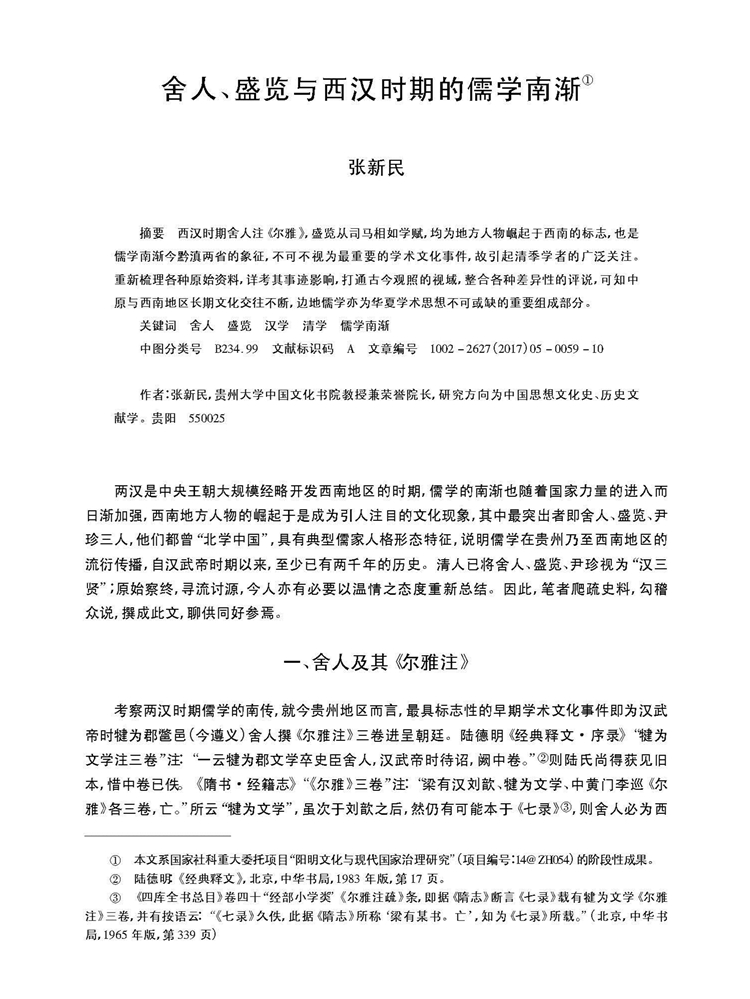 2017年第5期《孔子研究》刊载贵州大学中国文化书院教授兼荣誉院长张新民国家社科重大委托项目“阳明文化与现代国家治理研究”(项目编号:14@ZH054)的阶段性成果,题:舍人、盛览与西汉时期的儒学南渐。全文如下: