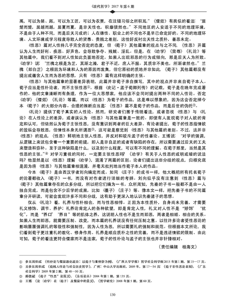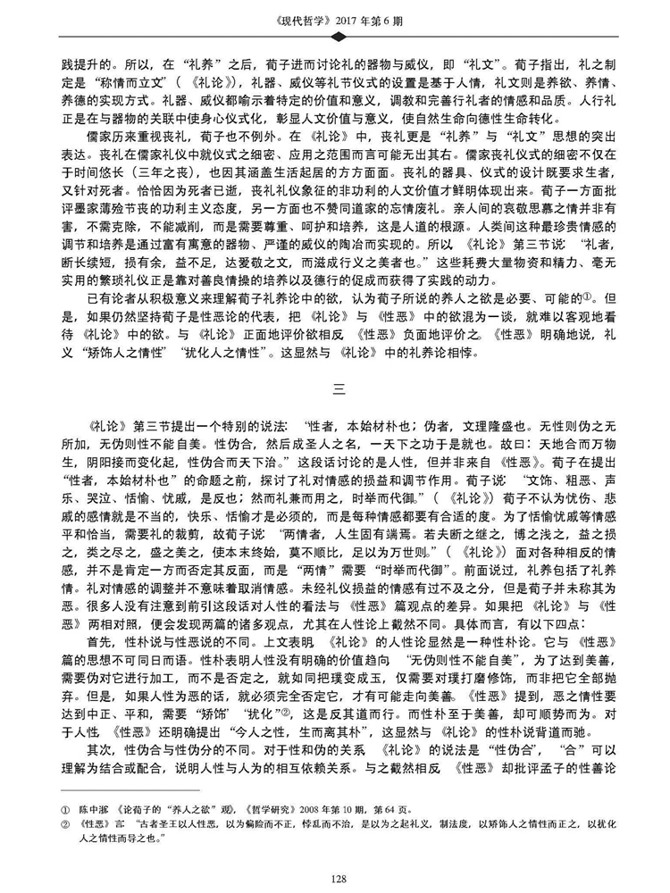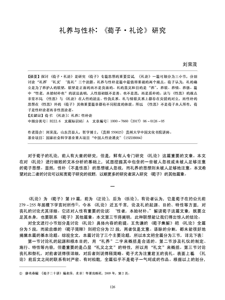 2017年第6期《现代哲学》刊载贵州大学中国文化书院讲师刘荣茂博士国家社会科学基金重大项目“中国人性论通史”(15ZDB004)研究成果,题:“礼养与性朴: 《荀子·礼论》研究”。全文如下: