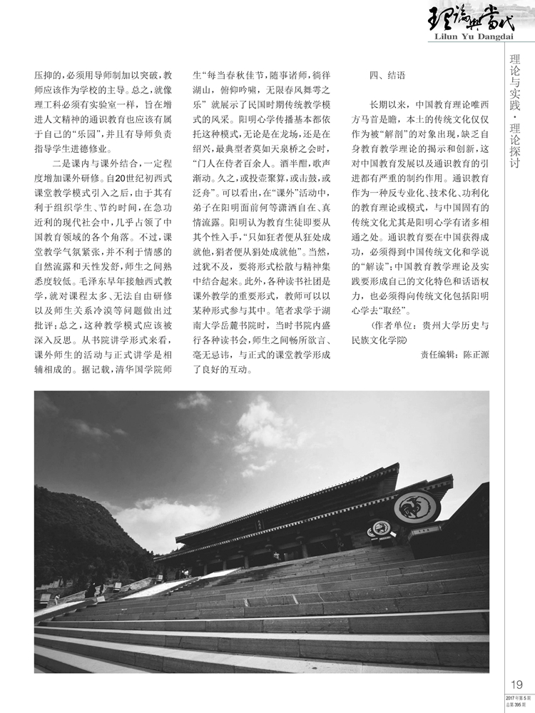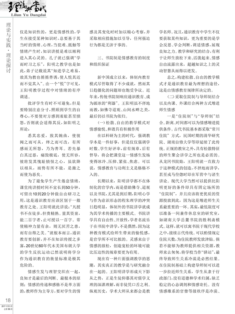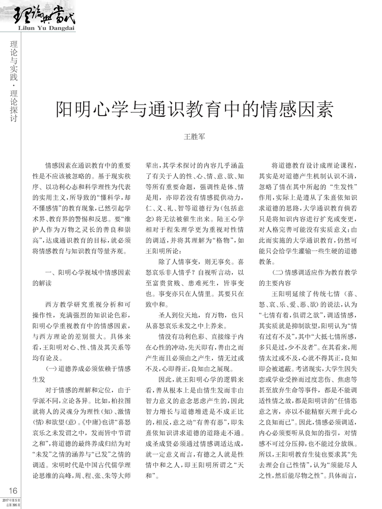 2017年第5期《理论与当代》刊载贵州大学历史与民族文化学院(中国文化书院)副教授王胜军博士研究论文,题:“阳明心学与通识教育中的情感因素”。全文如下: