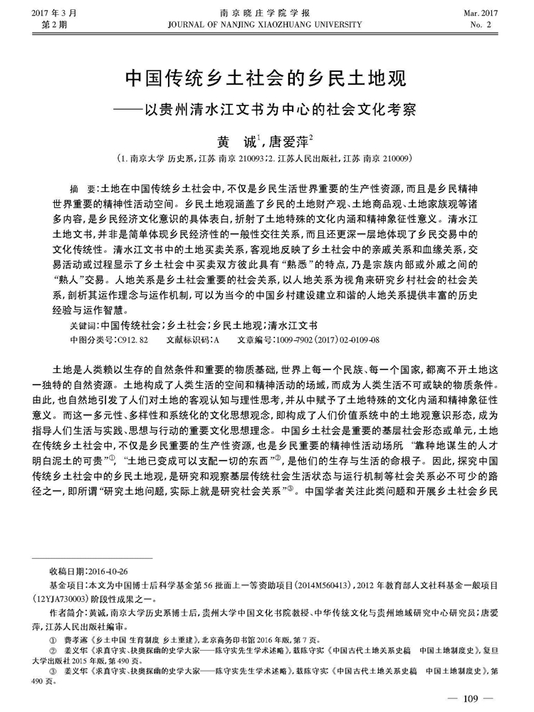 2017年3月第2期《南京晓庄学院学报》刊载南京大学历史系博士后、贵州大学中国文化书院教授、中华传统文化与贵州地域研究中心研究员黄诚以及江苏人民出版社编审唐爱萍中国博士后科学基金第56批面上一等资助项目(2014M560413)、2012年教育部人文社科基金一般项目(12YJA730003)阶段性成果,题:“中国传统乡土社会的乡民土地观——以贵州清水江文书为中心的社会文化考察”。全文如下: