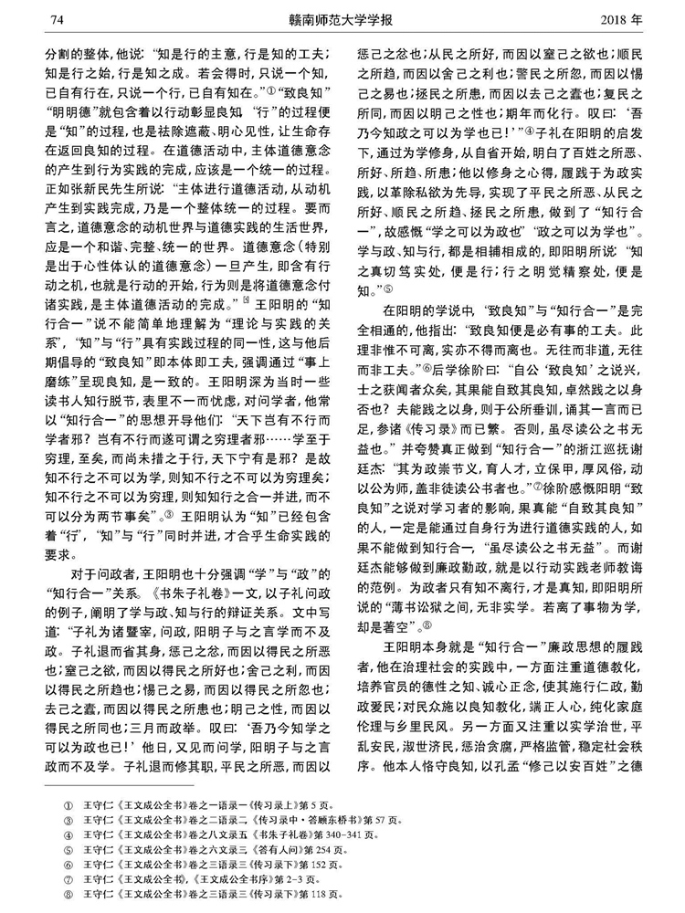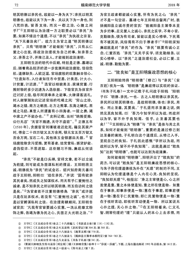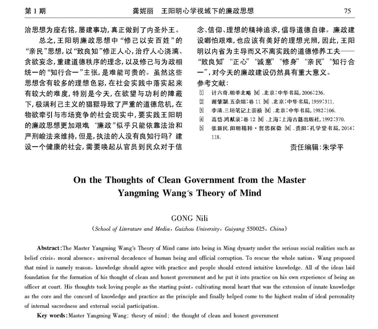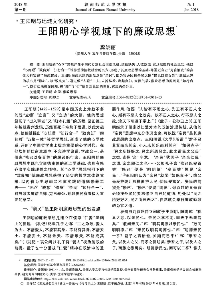 2018年第一期《赣南师范大学学报》刊载贵州大学文学与传媒学院教授、贵州省儒学研究会常务理事、贵州省美学学会副会长兼秘书长、贵州大学中国文化书院(阳明文化研究院)及中华传统文化与贵州地域文化研究中心兼职研究员龚妮丽国家社科基金重点项目(17AZX006)研究成果,题:王阳明心学视域下的廉政思想。全文如下: