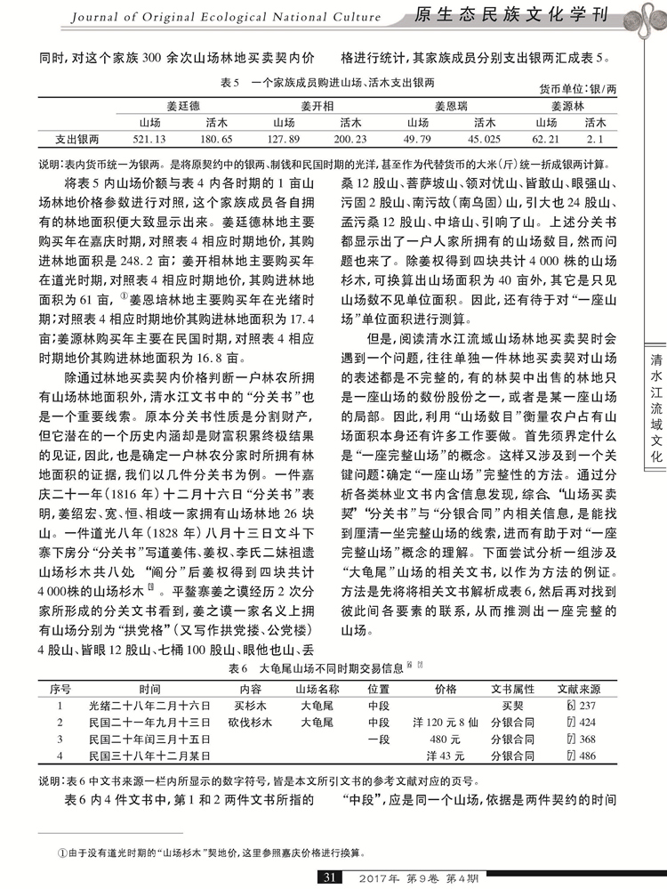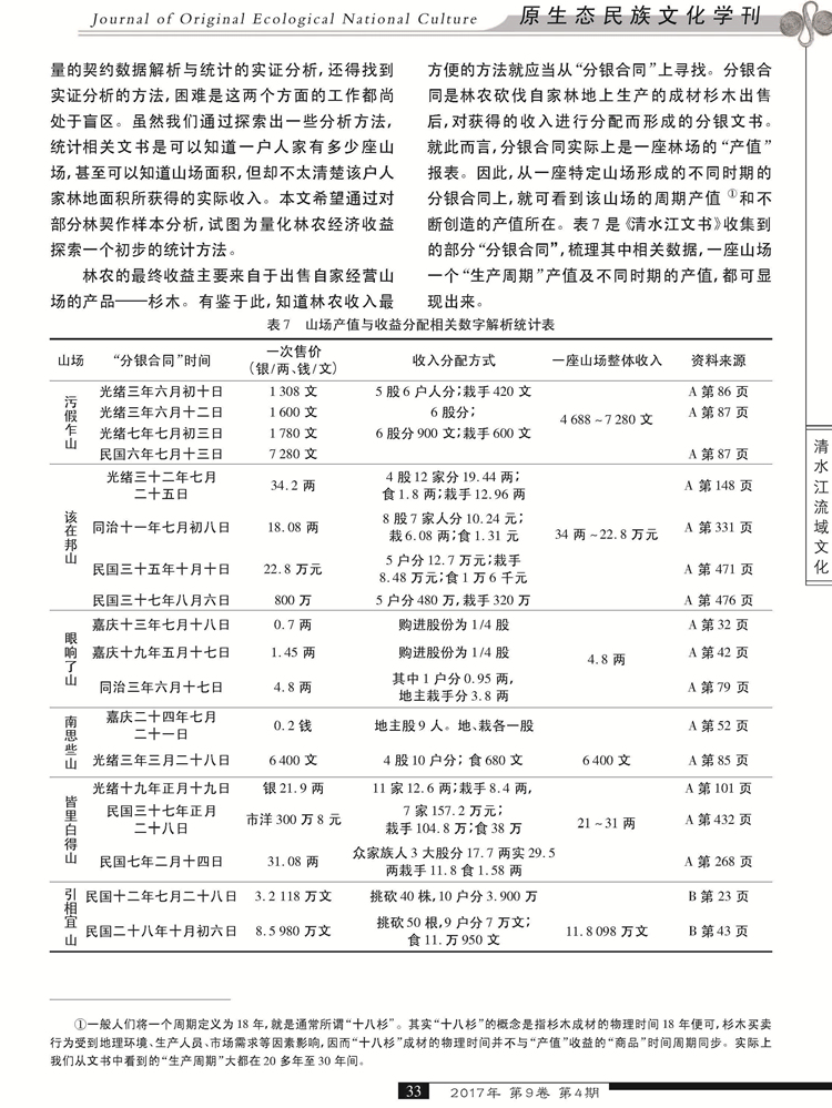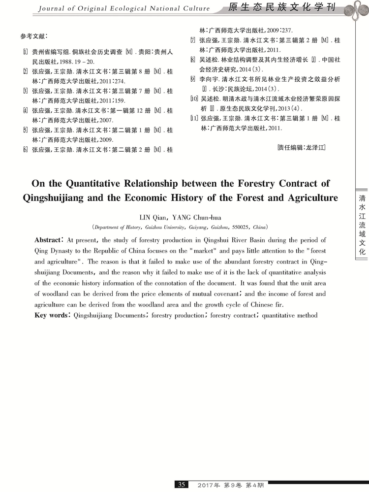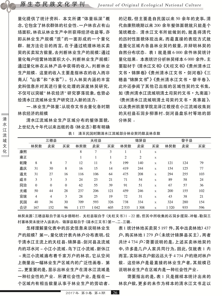2017年第9卷第4期《原生态民族文化学刊》刊载贵州大学历史与民族文化学院(中国文化书院)历史系、贵州大学“清水江研究中心”研究人员林芊教授及历史系硕士研究生杨春华国家社科基金一般项目“晚明至民国时期内地侗、苗民族地区土地买卖与地权分配研究”(14BZS069)、国家社科基金重大项目“清水江文书整理与研究”(11&ZD096)研究成果,题:清水江林业契约与林农经济史的量化关系研究。全文如下: