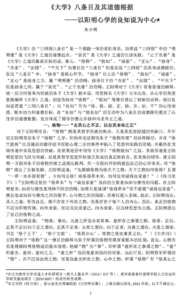 由教育部人文社会科学重点研究基地武汉大学中国传统文化研究中心主办的《人文论丛》2017年第2辑(总第28卷)刊载贵州大学历史与民族文化学院(中国文化书院、阳明文化研究院)原任教师、现任贵州大学阳明学院副教授、贵州省教育厅高等学校人文社科研究基地暨贵州省省级人文社科示范基地“贵州大学中华传统文化与贵州地域文化研究中心”兼职研究员朱小明博士有关“阳明学”研究论文,题:“王阳明诠释《大学》八条目及其道德根据”。