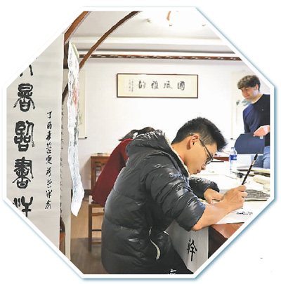 复旦大学书院学生在“经典研读书屋”中练习书法。光明图片