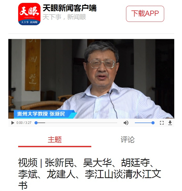 2019年6月27日《天眼新闻》客户端推送图文视频:张新民、吴大华、胡廷夺、李斌、龙建人、李江山谈清水江文书。图文视频链接如下: