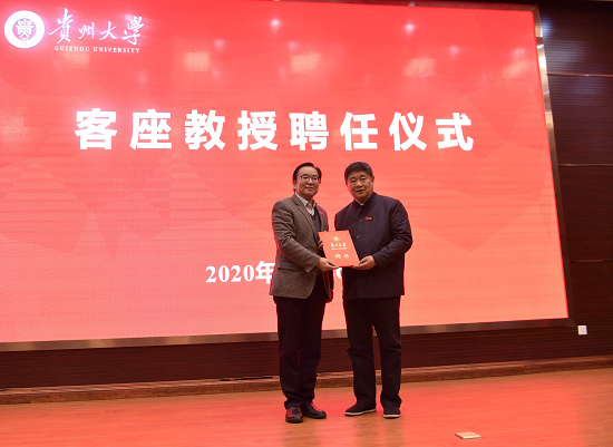 报告会场,我校聘请单霁翔担任历史与民族文化学院客座教授。校党委书记李建军为单霁翔颁授聘任证书,并佩戴贵州大学校徽。