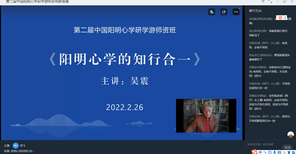 2月26日,第二届中国阳明心学研学游师资班迎来了新学期。当天上午,四川大学舒大刚教授做《儒家德教及其当代价值》专题讲座;下午,复旦大学吴震教授做《阳明心学的知行合一》专题讲座。我院教师、本届师资班学员刘凤霞参加了线上学习。