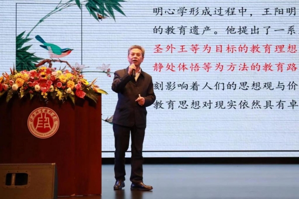 汪柏江教授从教育方法论的角度,通过“云板三声”“童子歌诗”“岩中花树”“诸生静坐僧寺”等一系列事例,介绍了王阳明教育思想中书院教育法、书信解疑法、随地开示法、静坐体悟法等十种教育方法。他认为王阳明教育思想是阳明心学的重要组成部分,是极为丰富又生动活泼的教育遗产,深刻影响着人们的思想观与价值观,对现实教育有着超凡的指导意义。
