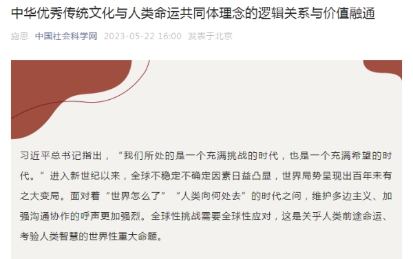 中华优秀传统文化绵延千载,博大精深,是中华民族的根与魂,是文化软实力的根本所在。其中蕴藉着的价值理念与伦理道德观对解决今天的现实问题仍有极大的指导意义。习近平总书记指出,“中国优秀传统文化的丰富哲学思想、人文精神、教化思想、道德理念等,可以为人们认识和改造世界提供有益启迪,可以为治国理政提供有益启示,也可以为道德建设提供有益启发。”人类命运共同体理念就是当代中国马克思主义与中华优秀传统文化价值融通的时代理论结晶,标志着马克思主义中国化的理论自信与实践自觉达到了新的历史高度。