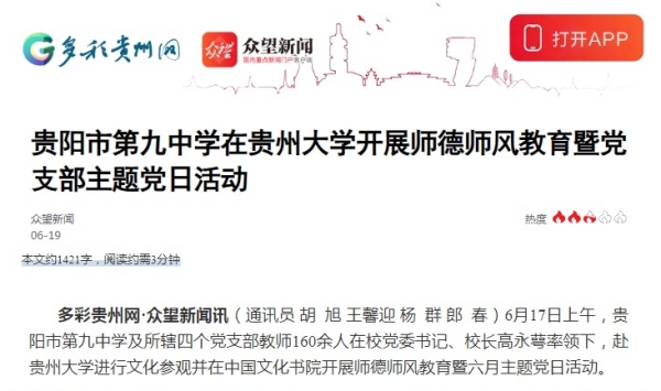 多彩贵州网·众望新闻讯(通讯员 胡旭 王馨迎 杨群 郎春)6月17日上午,贵阳市第九中学及所辖四个党支部教师160余人在校党委书记、校长高永萼率领下,赴贵州大学进行文化参观并在中国文化书院开展师德师风教育暨六月主题党日活动。