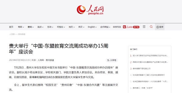 7月25日,贵州大学在东校区中国文化书院举行“中国-东盟教育交流周成功举办15周年”座谈会。副校长周少奇出席会议,学校相关部门、学院主要负责人参加会议。来自老挝、泰国、越南、印度尼西亚、柬埔寨和缅甸的16名东盟国家的贵州大学留学生参与交流。