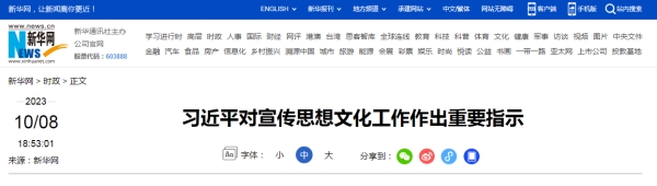 新华社北京10月8日电 中共中央总书记、国家主席、中央军委主席习近平近日对宣传思想文化工作作出重要指示指出,宣传思想文化工作事关党的前途命运,事关国家长治久安,事关民族凝聚力和向心力,是一项极端重要的工作。党的十八大以来,党中央从全局和战略高度,对宣传思想文化工作作出系统谋划和部署,推动新时代宣传思想文化事业取得历史性成就,意识形态领域形势发生全局性、根本性转变,全党全国各族人民文化自信明显增强、精神面貌更加奋发昂扬。