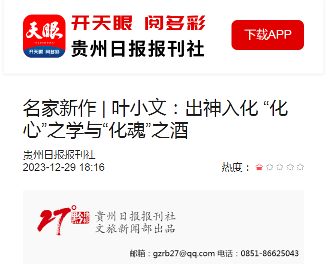 阳明心学出贵州,茅台美酒出贵州。两者相连并非偶然,乃中华传统文明在贵州的“道法自然”,乃建设多彩贵州文化强省的“物华天宝”,乃天人合一在贵州的“出神入化”。