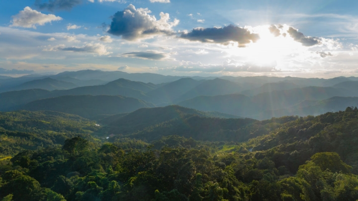 这是2023年9月16日拍摄的日落时分的云南普洱景迈山风光(无人机照片)。新华社记者 胡超 摄
