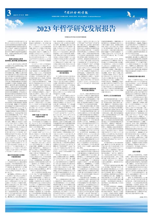 以哲学的方式回答中国之问、世界之问、人民之问、时代之问,不断推出有深刻思想性的高质量研究成果,加快构建具有鲜明中国特色的哲学学科“三大体系”,是新时代中国哲学界的历史使命。2023年的哲学研究,以重大时代问题研究促进哲学基础理论研究,在面向实践的理论研究与创新中彰显中国智慧。
