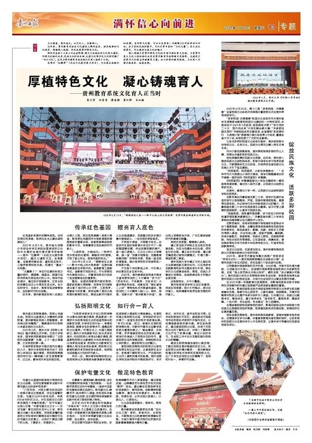 深入挖掘多彩贵州特色文化的丰富内涵和重大价值,多彩贵州重大文化工程的转化运用在贵州教育系统持续开花结果,为建设多彩贵州文化强省贡献教育力量。如今的贵州教育战线,文化育人可谓正逢其时、恰逢其势。