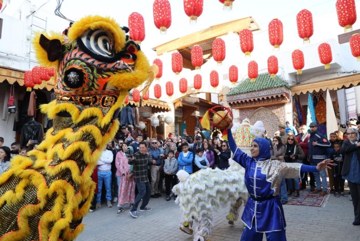 1月22日,人们在摩洛哥首都拉巴特老城里观看舞狮表演。当日,由中国文化和旅游部、中国驻摩洛哥大使馆主办的2024摩洛哥“欢乐春节·中国庙会”活动在摩洛哥首都拉巴特开幕,迎接即将到来的中国农历龙年春节。新华社记者 霍晶 摄