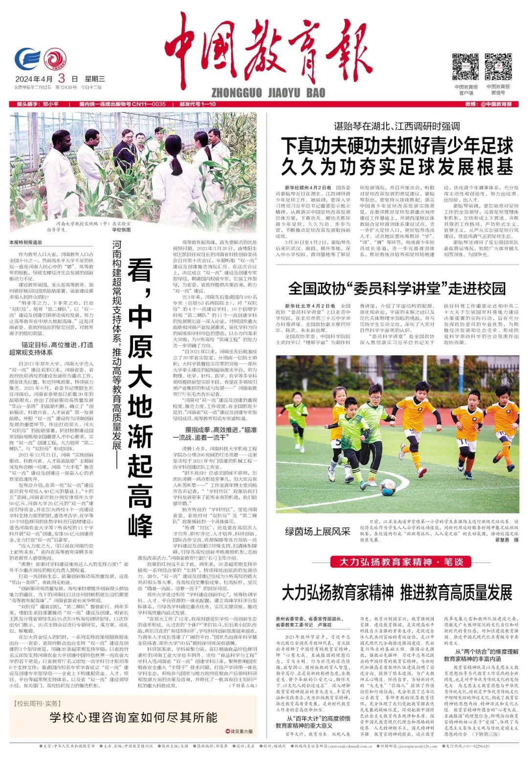 2023年教师节前夕,习近平总书记致信全国优秀教师代表,首次提出并阐释了中国特有的教育家精神,即“心有大我、至诚报国的理想信念,言为士则、行为世范的道德情操,启智润心、因材施教的育人智慧,勤学笃行、求是创新的躬耕态度,乐教爱生、甘于奉献的仁爱之心,胸怀天下、以文化人的弘道追求”。深入理解教育家精神提出的重大意义、丰富内涵和实践要求,大力弘扬教育家精神,推进教育高质量发展,是新时代教育工作者的崇高使命担当。