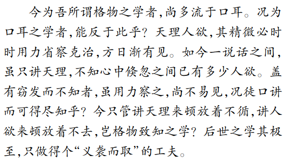 显然,在王阳明看来,“今为吾所谓格物之学者,尚多流于口耳”,况为朱子格物致知之学乎,这也就是明代从官场到学界的一种时代通病,也是其所谓“口耳之学”泛滥成灾的根源;而这种“口耳之学”之极致,说到底也不过是训练一种“‘义袭而取’的工夫”而已。这正是明代官场学界内外背反、说一套做一套之双重人格现象之社会心理上的根源。很明显,阳明的“身心之学”,不仅就直接针对这种“口耳之学”而发,而且从根本上说,也就是为了对治这种“口耳之学”,才有所谓“身心之学”的提出。