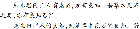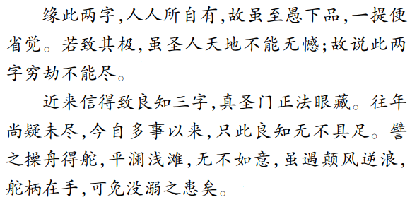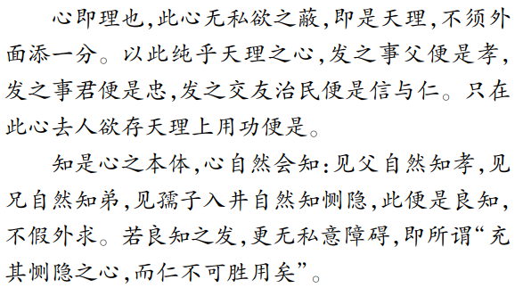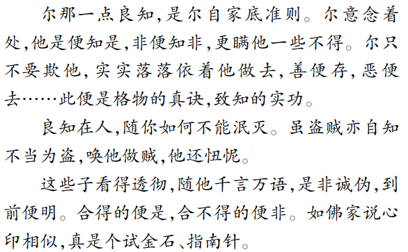 无论我们赞成与否,上述两条无疑都是围绕着良知之内在性展开的,所以也就有了“人人所自有”以及“只此良知无不具足”一说。这表明,作为“天理之昭明灵觉处”的良知已经落实于愚夫愚妇之内在心灵世界了。这样看来,如果说阳明学作为心学之区别于朱子理学就在于其所坚持的“心即理”——将天理从人性落实到人的心灵层面上,那么其进一步的发展也就在于对道德本心的推进并落实于“随时知是知非”的道德良知之间了。