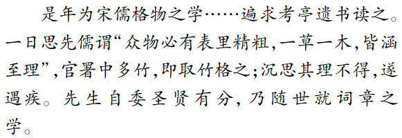 不过,在明代“此亦一述朱,彼亦一述朱”的时代氛围中,王阳明“读书学圣贤”的志向也只能按照朱子学的路径来设计。所以,当其高中浙江乡试之后,也就有了一段按照朱子之教导进行“格竹子”实践的公案。其《王阳明年谱》在二十一岁下记载: