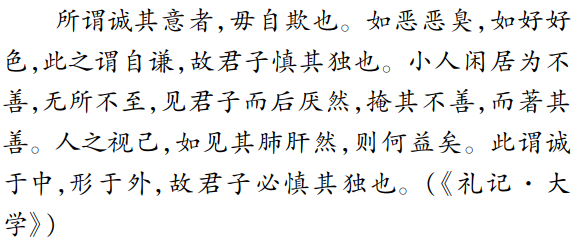 所以到了《大学》,也就将儒家的这种“慎独”精神与“毋自欺”之“诚意”传统统一起来表达,《大学》写道: