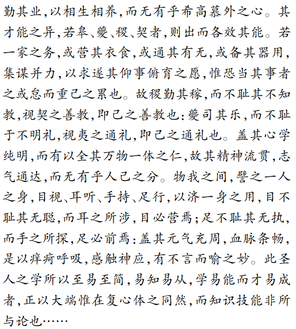 在这一段从“三代”之圣贤——皋、夔、稷、契到当下社会之现实主体——农、工、商、贾(亦可称之为士、农、工、商)再到人人所同具的耳目手足四肢以及我们每个人当下都可以理解的目视、耳听、手持、足行的关系中,一下子就澄清了每一个个体的立身之则与应世之务。而在所有这些活动中,每一个个体,也都可以像皋、夔、稷、契一样:“稷勤其稼,而不耻其不知教,视契之善教,即己之善教也:夔司其乐,而不耻于不明礼,视夷之通礼,即己之通礼也”,这就像我们自身的耳目手足,虽各有其能,也各有其所长,但说到底,也都是为了“以济一身之用”。这就不仅是个体的立身之则,同时也包含着整个社会之不同行业相互默契配合的应世之务。